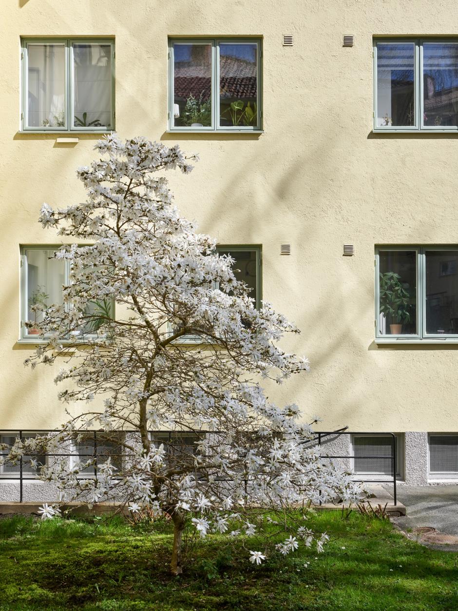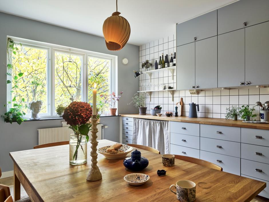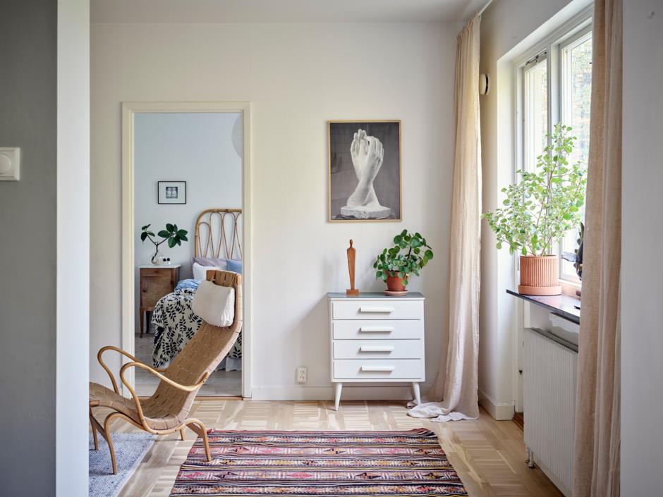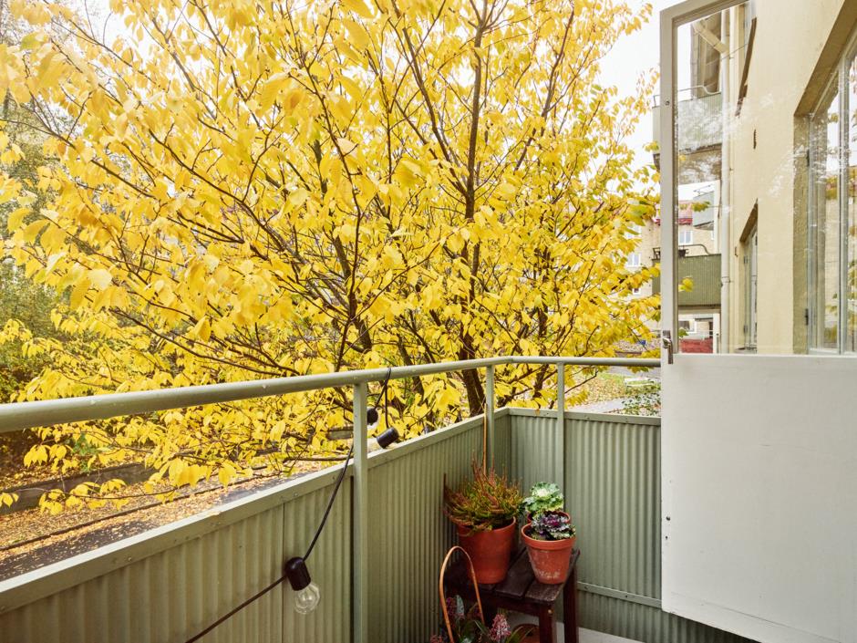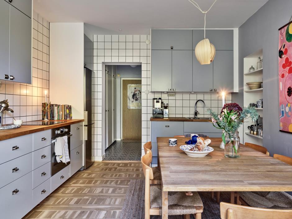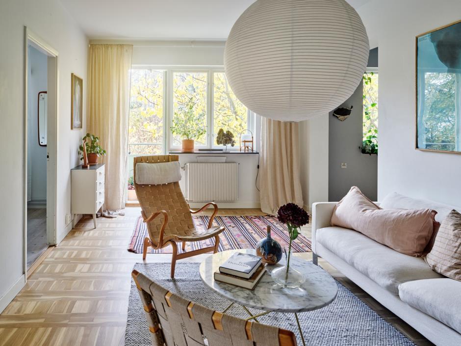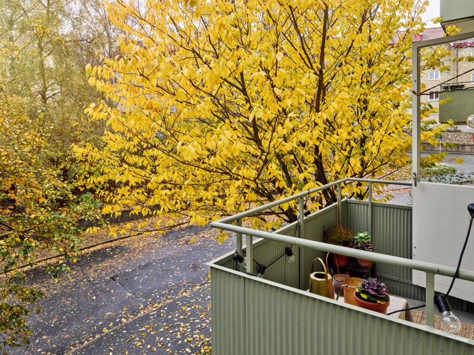 I hjärtat av Majorna ligger den här fina funkisfyran som totalrenoverats de senaste tio åren. Köket är ovanligt rymligt och är renoverat i tidstypisk funkisstil. Här finns gott om plats för både matlagning och långa middagar för både familj och vänner. Vardagsrummet ligger intill med halvöppen planlösning mellan och härifrån når man också lägenhetens soliga söderbalkong av salviagrön veckad plåt. Precis intill balkongen står ett vackert körsbärsträd som översållas av rosa blommor på våren.