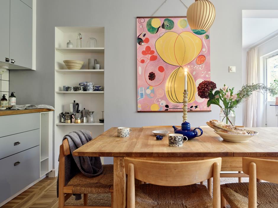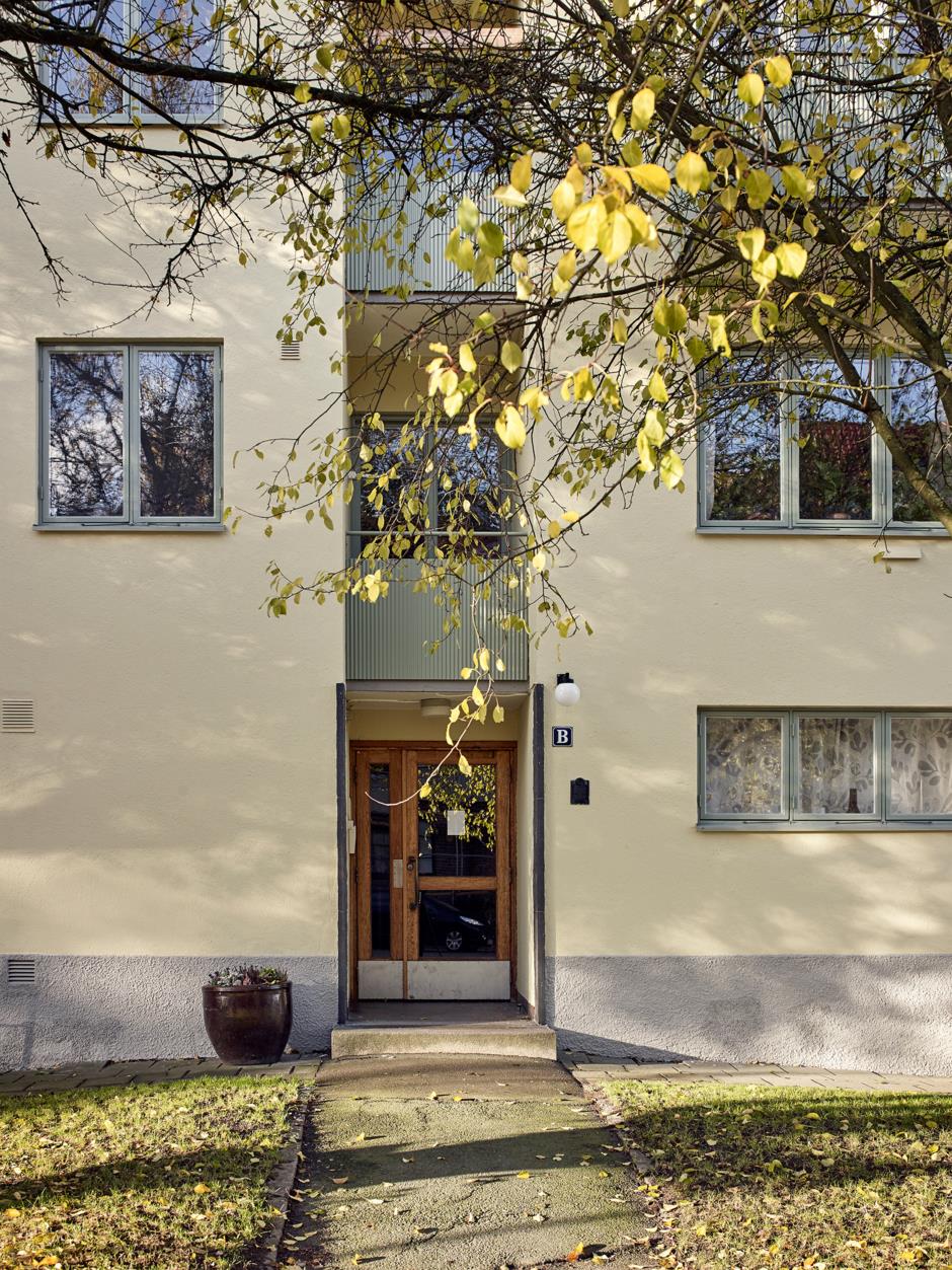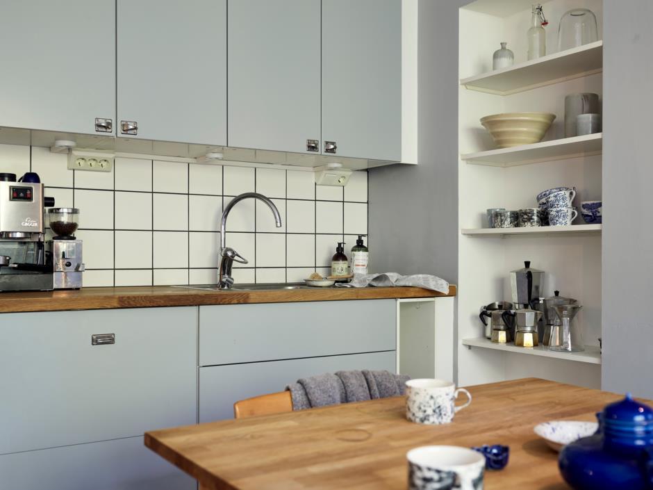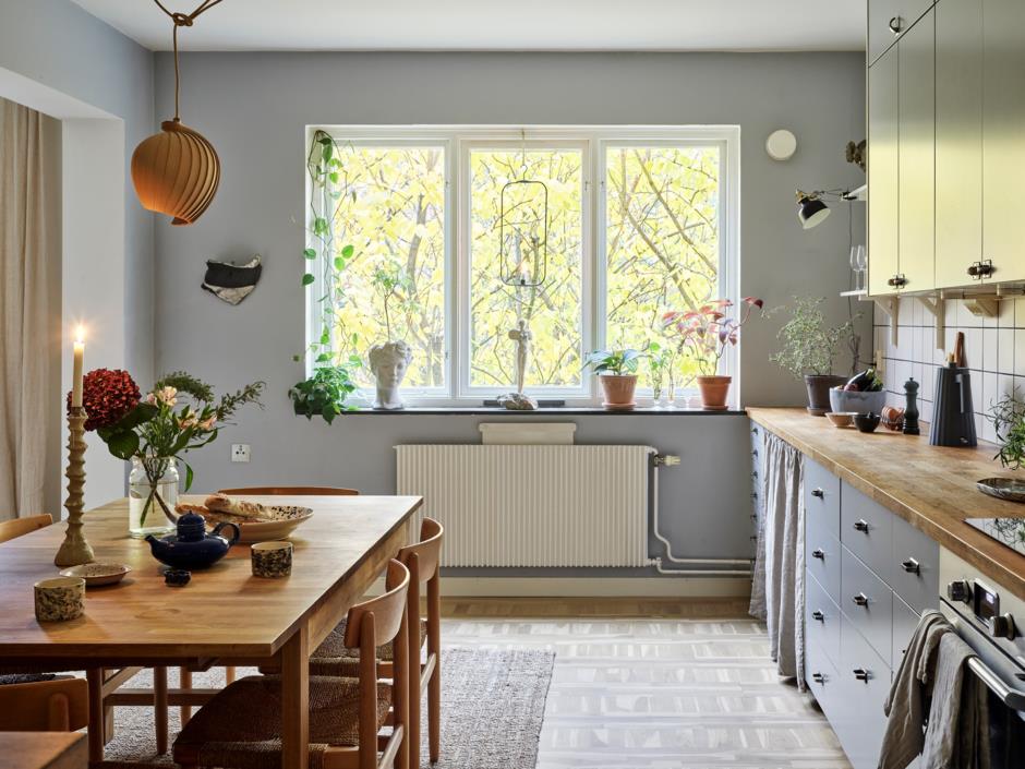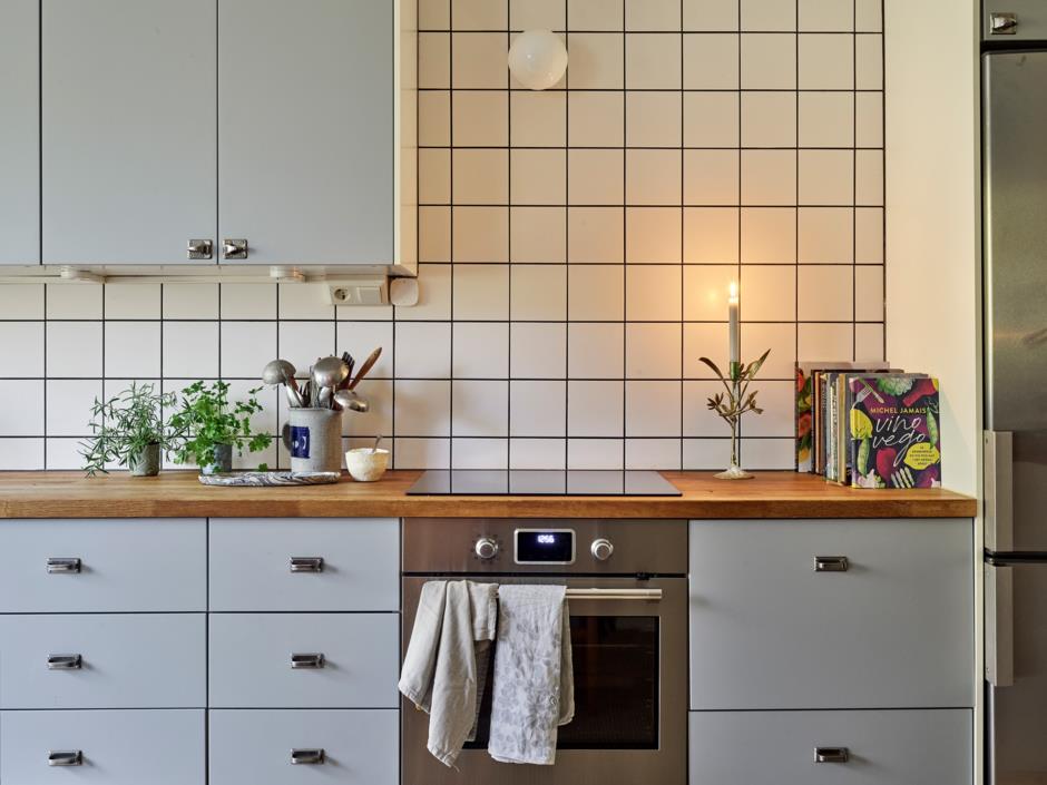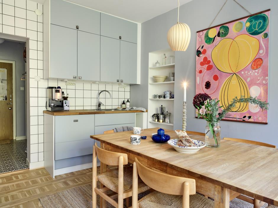 I hjärtat av Majorna ligger den här fina funkisfyran som totalrenoverats de senaste tio åren. Köket är ovanligt rymligt och är renoverat i tidstypisk funkisstil. Här finns gott om plats för både matlagning och långa middagar för både familj och vänner. Vardagsrummet ligger intill med halvöppen planlösning mellan och härifrån når man också lägenhetens soliga söderbalkong av salviagrön veckad plåt. Precis intill balkongen står ett vackert körsbärsträd som översållas av rosa blommor på våren.