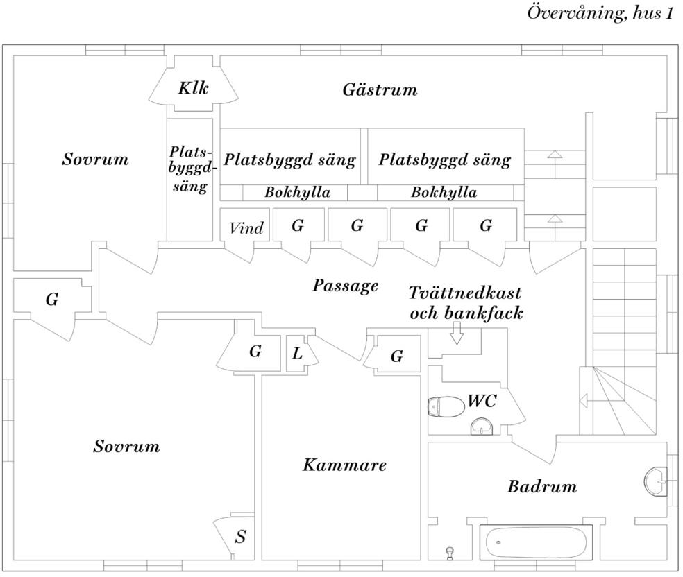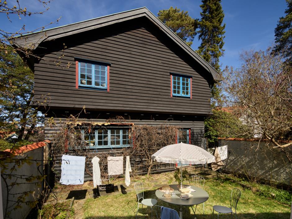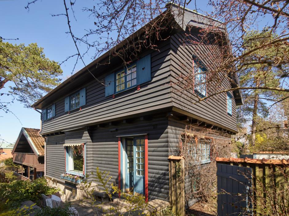 "Vill man ha ett hus vid sidan av den arkitektoniska allfartsvägen kan det kanske löna sig att söka efter ett gammalt träpalä från den tiden då fantasin varken behövde ta hänsyn till kvadratmeter eller vedertagen standard". Så står det i en gammal artikel om detta fantastiska hus som då liksom nu är långt ifrån normen med sitt sagohusliknande yttre och fantasifullt inredda inre. Här finns blyinfattade fönster med hjärtdekorerade blå luckor, gotiska nischer och badrum som liknar ett Hagabadet i miniformat bara för att nämna några av de många både finurliga och vackra detaljerna. Mest imponerade är kanske det stora vardagsrummet med sin naturstensdekorerade eldstad och tak i nock, det man inte ser är dock att nocken är en illusion och att det finns ett sovrum ovanför. Ovanvåningen rymmer fyra sovrum varav två med platsbyggda sängar och fungerande ringklocka ner till köket - praktiskt för den i familjen som får sovmorgon men också en rolig detalj från svunna tider. Det fjärde sovrummet har ett piggt gult handfat som dock är taget ur bruk.